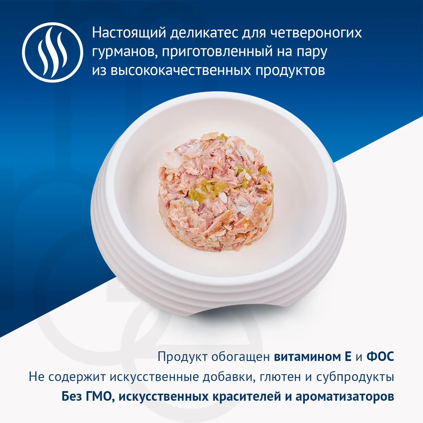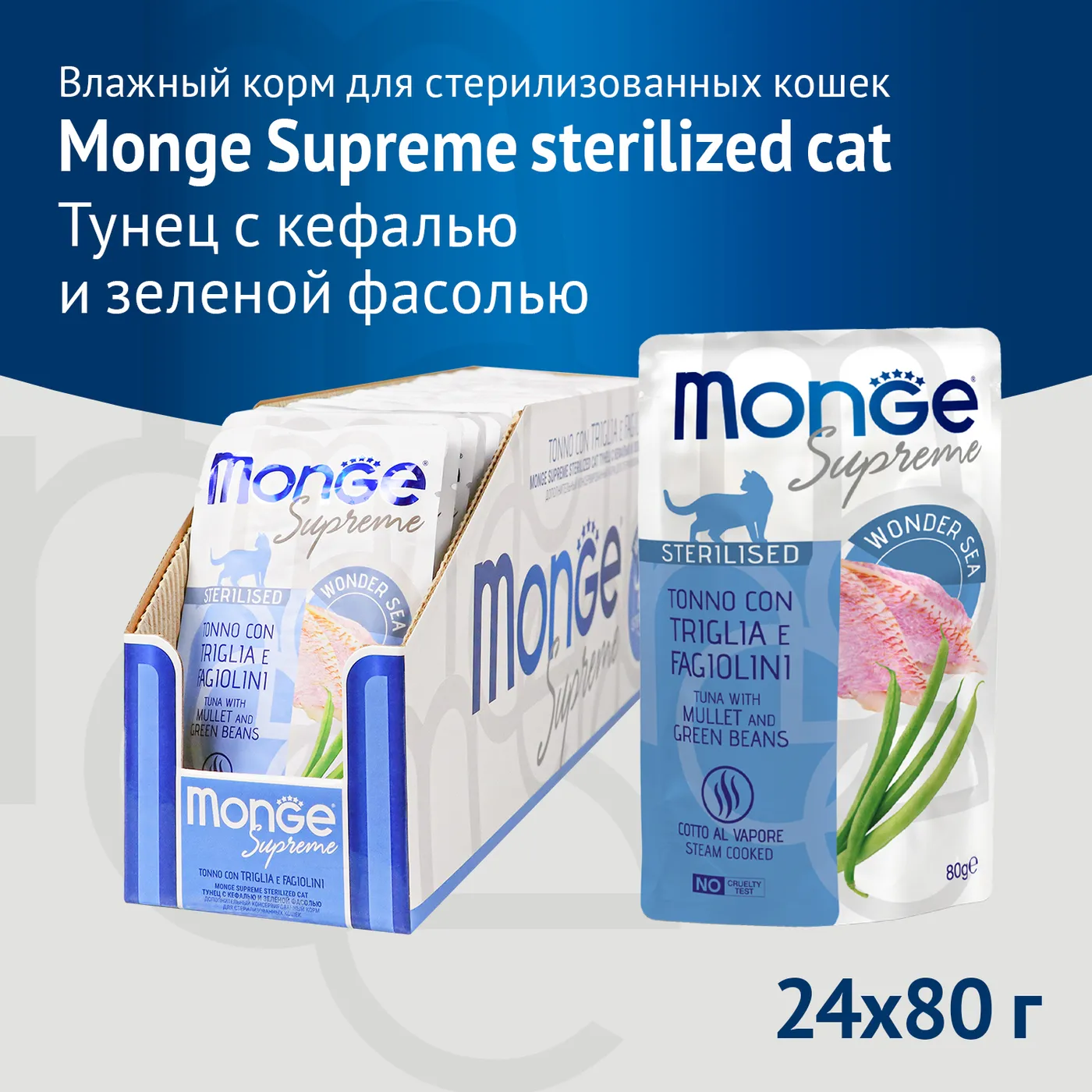 Влажный корм Monge Supreme Sterilized Cat предназначен для стерилизованных кошек. Основными источниками белка в составе являются тунец и кефаль. Продукт содержит зелёную фасоль, обогащён фруктоолигосахаридами (ФОС) и витамином Е, не содержит злаков, искусственных красителей, ароматизаторов и ГМО. Консистенция — паштет.