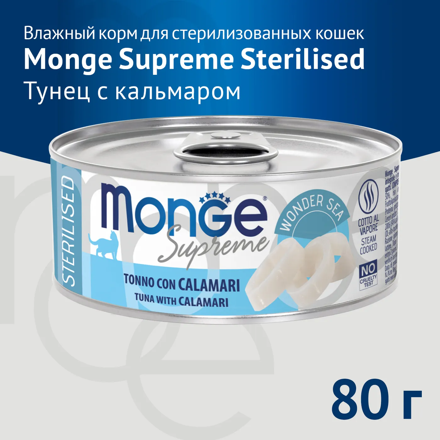 Влажный корм Monge Supreme Sterilized разработан для стерилизованных кошек. Основу рецепта составляет тунец (50%) с добавлением кальмара (5%). Продукт содержит фруктоолигосахариды (F.O.S.) и витамин Е, не включает искусственные красители и ароматизаторы. Консистенция корма — паштет. Корм подходит для ежедневного кормления взрослых кошек.