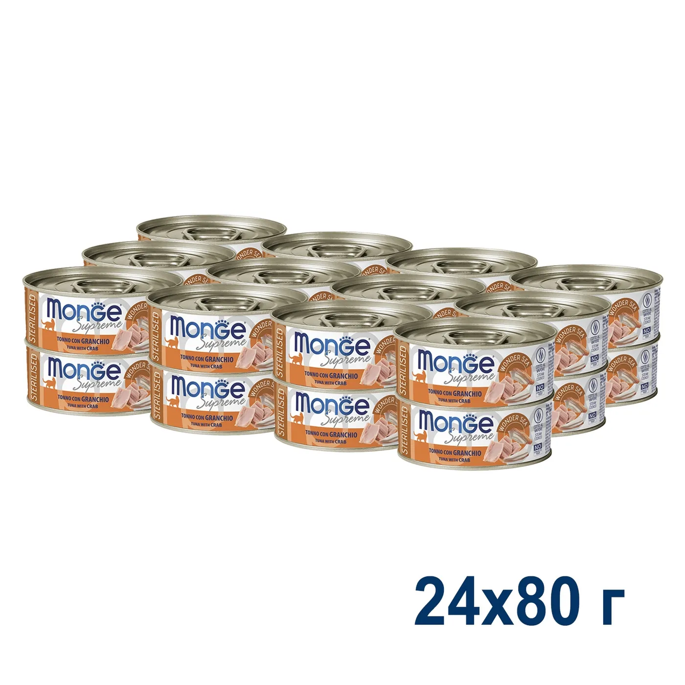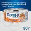 Влажный корм Monge Supreme Sterilized предназначен для стерилизованных кошек. Основные ингредиенты — тунец (50%) и краб (5%). Состав дополнен фруктоолигосахаридами (F.O.S.) и витамином Е. Формула не содержит злаков, искусственных красителей и ароматизаторов. Продукт приготовлен на пару.