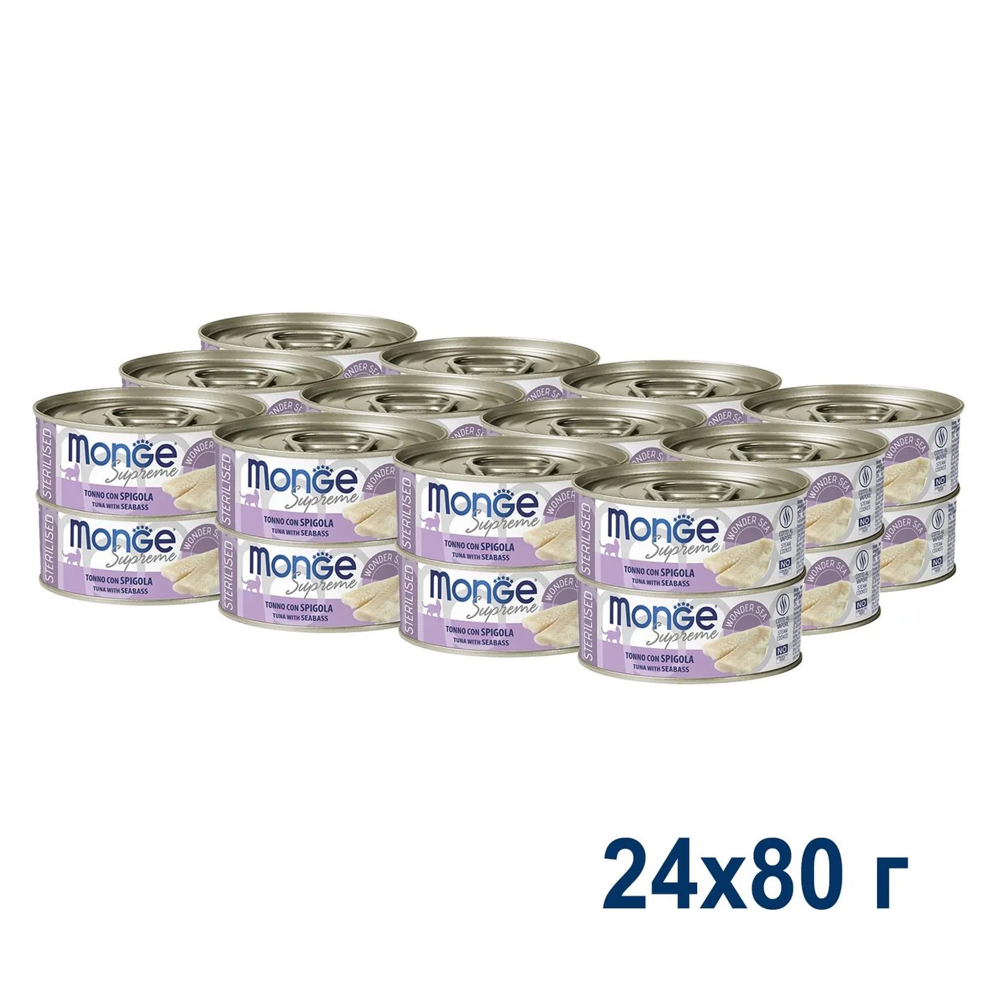 Влажный корм Monge Supreme Sterilized предназначен для стерилизованных кошек. Основу состава составляет тунец (50%) с добавлением морского окуня. Рецепт обогащен фруктоолигосахаридами (F.O.S.) и витамином E. Корм не содержит искусственных красителей, ароматизаторов и ГМО.